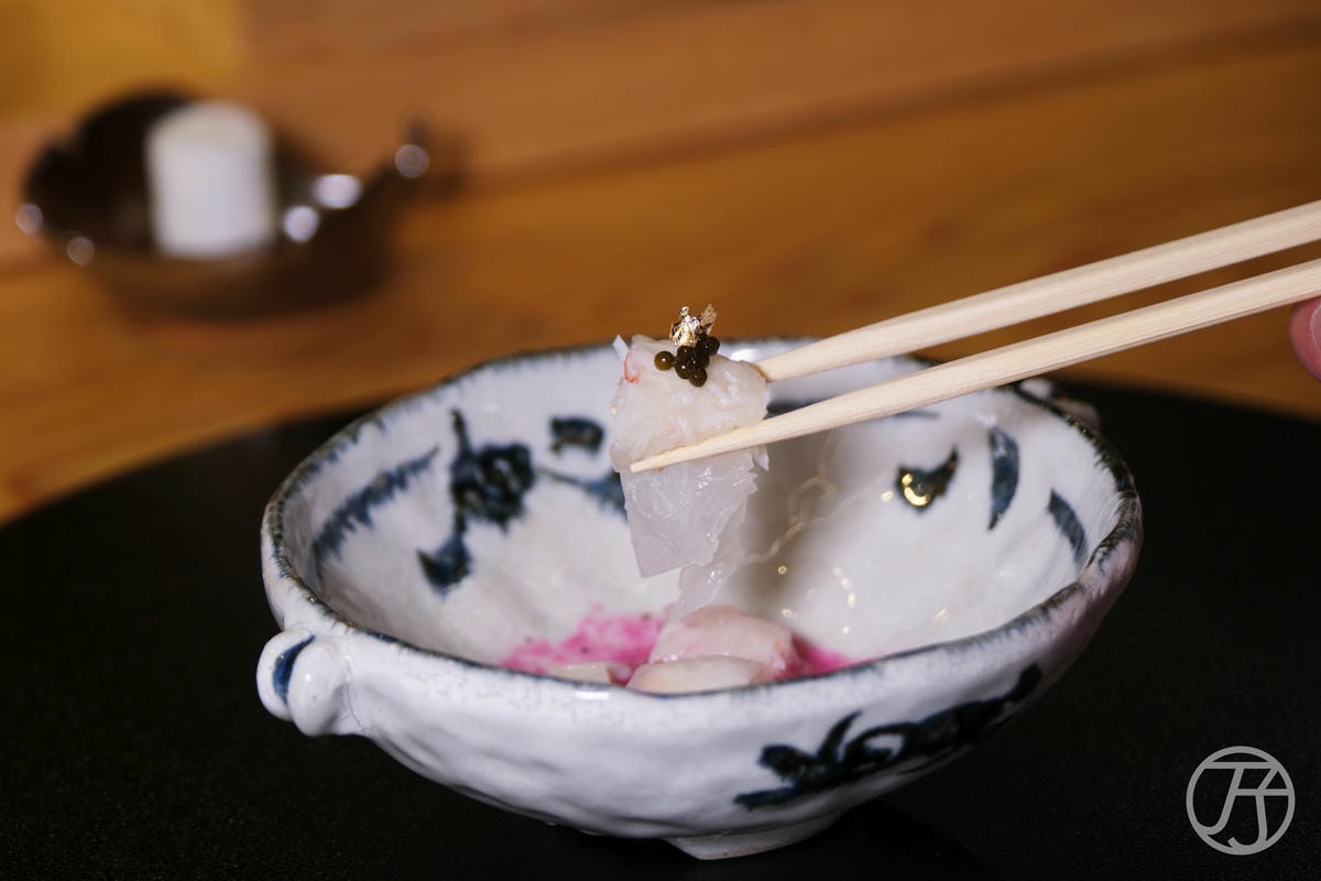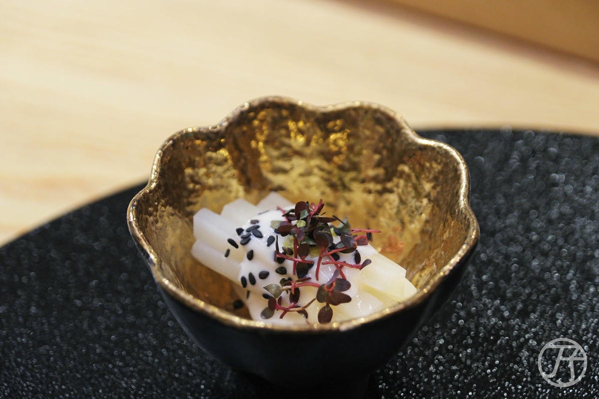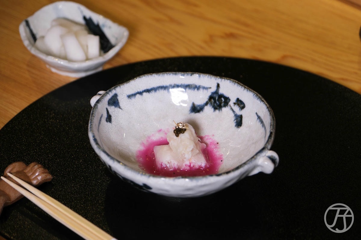 第一道料理主廚為我們呈現的是醋漬大根捲蟹肉,將日本料理常用的大根(蘿蔔),切成薄片包裹蟹肉,再妝點上魚子醬與食用金箔,大根吃起來口感爽脆,帶有醋漬的舒適酸感,底部的醬汁使用的是火龍果醬,可以增加更多的酸甜感,味道十分清爽,才上第一道前菜,就可以感受到主廚的料理巧思。