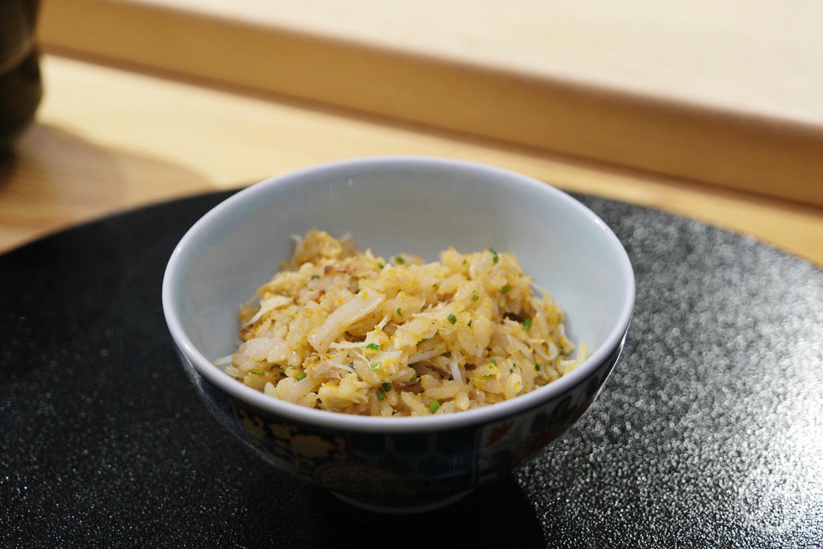從台灣傳統菜紅蟳米糕發想而來,主廚使用紅蟳搭配日本米,以及豐富的海味食材一同炊煮,釜飯一上桌就可以聞到淡雅的紅蟳香氣,米飯在炊煮的過程中,已經充分吸收紅蟳與蟹肉的香氣,搭配畫龍點睛的香菇口感,可以吃到滿滿的紅蟳與蟹肉香氣,讓你一口接一口,回味無窮。