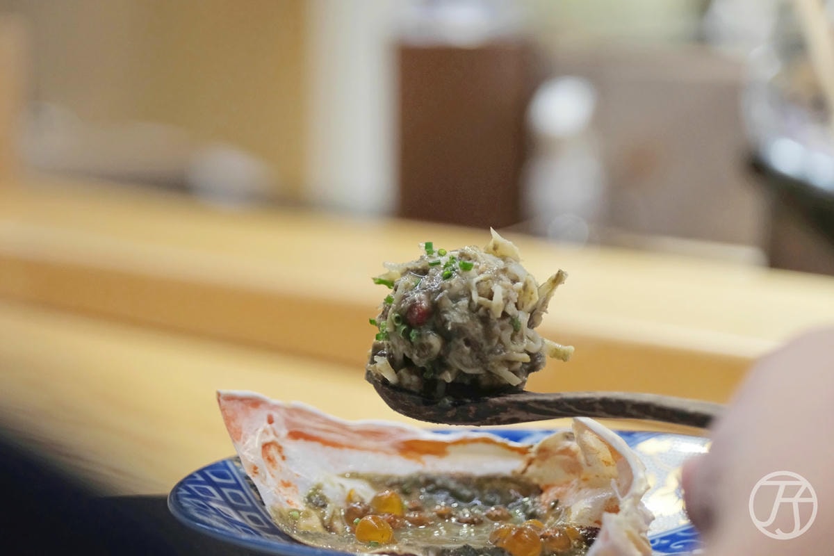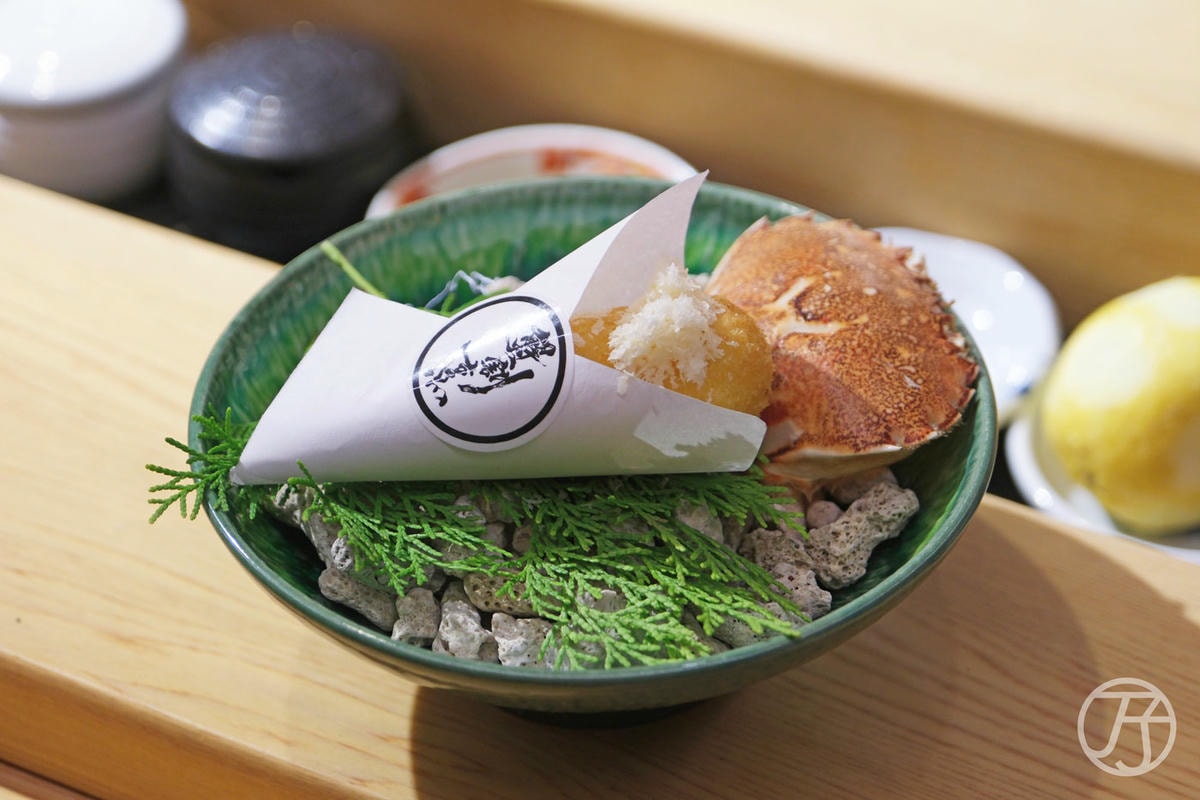 將蟹肉處理絲滑軟綿狀態,搭配蟹膏點綴,直接用最中餅包裹品嚐,可以吃到最中餅的酥脆與蟹肉的細緻口感,是一道相當有特色的料理。