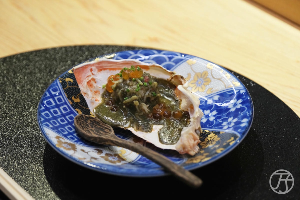 蟹肉鮭魚卵海膽甲羅燒,使用蟹殼做為容器搭配,以蟹膏、鮭魚卵、海膽依黃金比例搭配,入口可以吃到海中最迷人的鮮味,入口先吃到鮭魚軟在口中爆發鮮味,蟹膏與海膽的鮮甜風味隨之散出,鮮度一層一層的堆疊而出,味道豐富鮮味十足。