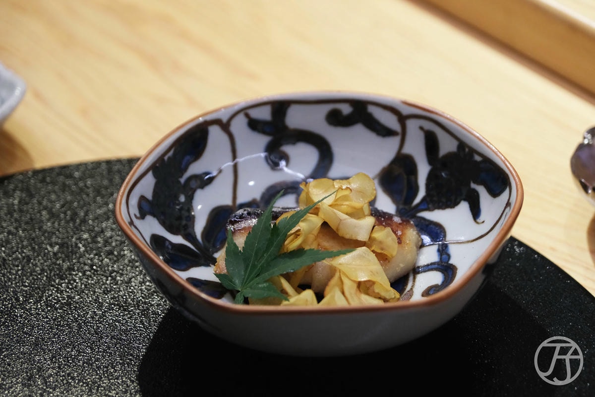日本料理中常使用的鰤魚,主廚巧妙的搭配栗子片,大家在品嚐鰤魚時可以搭配品嚐,栗子片吃起來的口感與洋芋片相當類似,脆口又不會有油膩的感覺,鰤魚口感扎實帶有淡淡甘甜滋味。